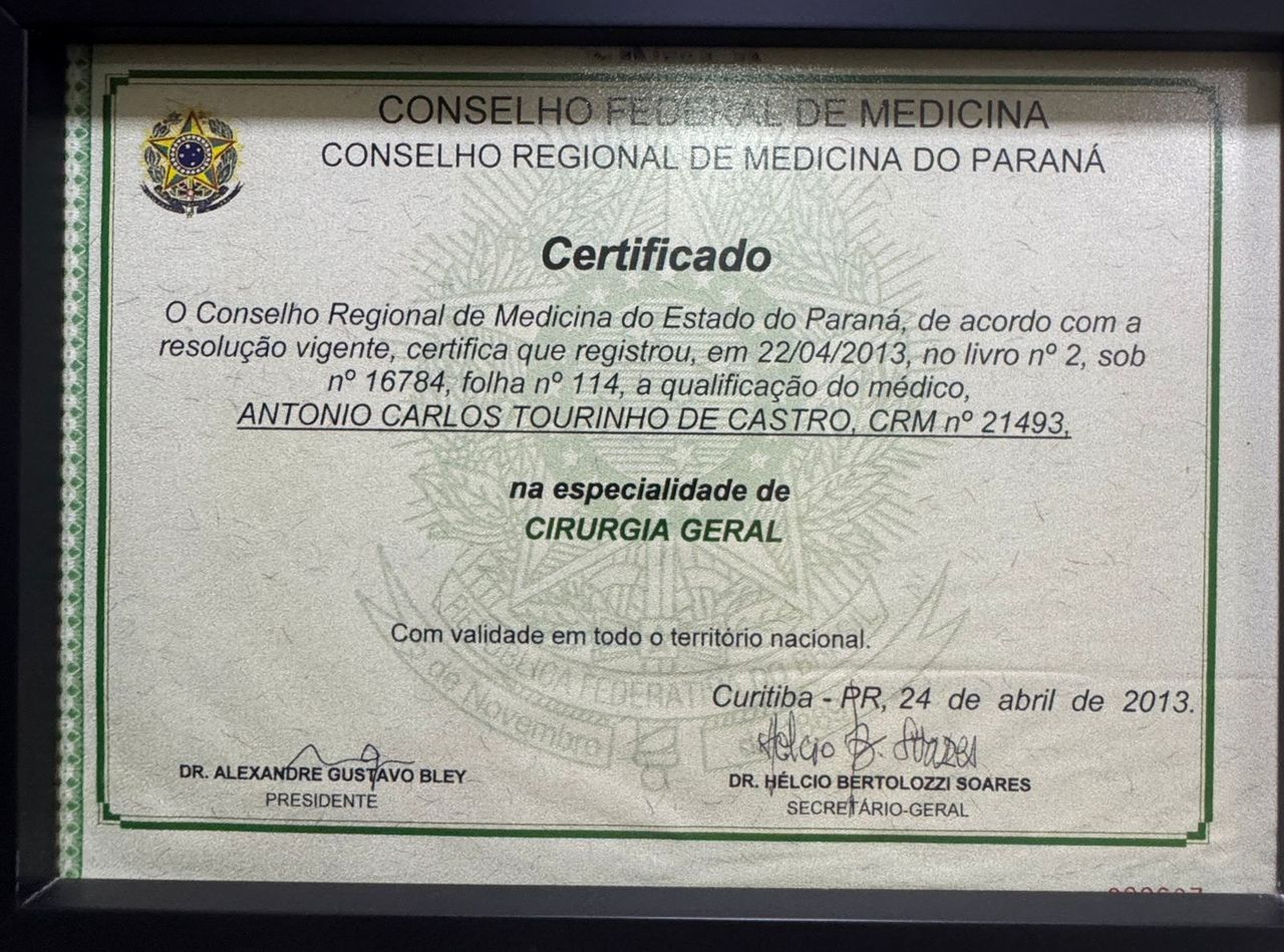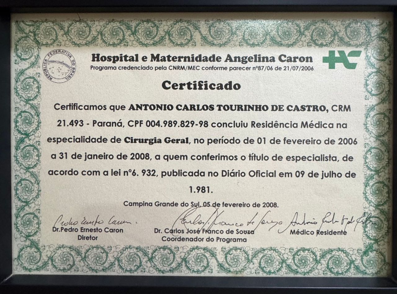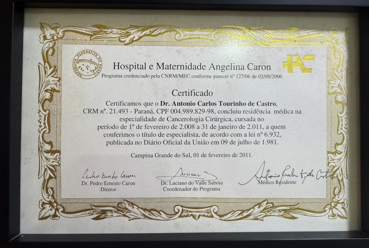 Desde 2011, o Dr. Antonio Carlos Tourinho de Castro dedica sua expertise à região de Arapongas, onde atua como Responsável Técnico pela Oncologia Cirúrgica do Hospital do Norte do Paraná (Honpar), um serviço que ele assumiu e desenvolve continuamente.
